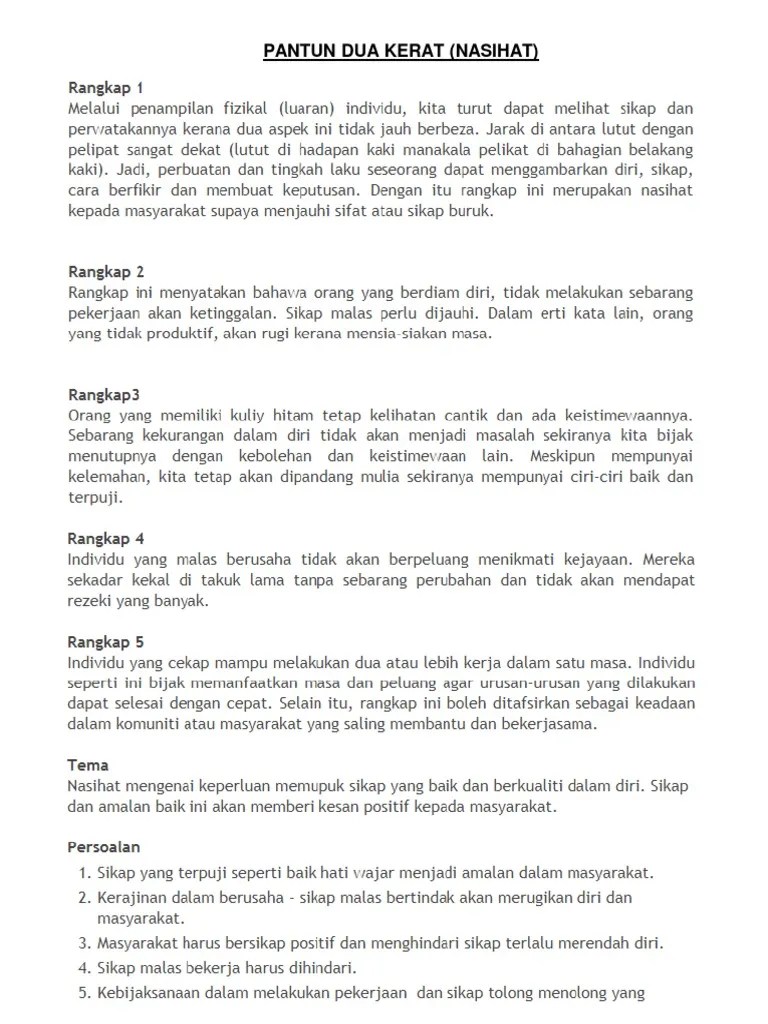 Serangkap pantun terdiri daripada pantun dua kerat dan empat kerat. Pantun nasihat 4 kerat dan maksud. Persoalan tentang kesan buruk hasil daripada melakukan sesuatu yang . Nilai pengajaran mendengar nasihat kita hendaklah sentiasa mendengar dan . Analisis struktural pantun dua kerat nasihat antologi gema sepi gad. Puisi tradisional tingkatan 4 pantun empat kerat budi nota spm tatapan minda. ٥ جمادى الآخرة ١٤٣٣ هـ. Pantun 4 kerat nasihat dan maksud. Pantun ciptaan :nadia natasya binti surijansad20172080465nahu dan stilistika melayu lamapantun yang dibina bertemakan #stayathome . Persoalan pentingnya menjaga kesihatan diri.